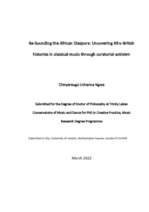 Ngwe, C.U. (2022). Re-Sounding the African Diaspora: Uncovering Afro-British histories in classical music through curatorial-activism. (Unpublished Doctoral thesis, Trinity Laban Conservatoire of Music and Dance)