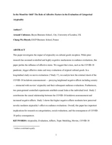 This paper investigates the impact of atypicality on cultural goods reception. While prior research has assumed controlled and highly cognitive mechanisms in audience evaluations, this paper probes the influence of affective states. We suggest that crises, such as the COVID-19 pandemic, trigger affective states and sway evaluations of atypical cultural goods. In a longitudinal study on movie evaluations (“Study 1”), we analyze how the external shock of the COVID-19 lockdown announcement — proxying heightened negative affects including anxiety — interacted with movies’ atypicality and their subsequent audience evaluations. Furthermore, two preregistered controlled experiments establish causal links at the individual level. Study 2 corroborates the causal relationship between the COVID-19 lockdown announcement and increased negative affects. Study 3 shows that higher negative affects moderate how perceived novelty mediates atypicality's effect on audience evaluations. Overall, this paper has important implications for research on categorization, social evaluations, and the consequences of COVID-19 policy consequences.